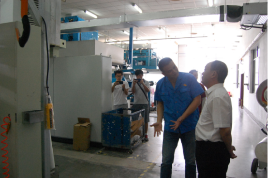 隨后羅副主任、彭副縣長(zhǎng)提出參觀生產(chǎn)車間,在常務(wù)副總李衛(wèi)民、副總鄭濤、技術(shù)總監(jiān)徐勁、行政總監(jiān)黃令的引導(dǎo)下,羅副主任一行來(lái)到了公司凹印車間,參觀我們的生產(chǎn)設(shè)備,了解產(chǎn)品的生產(chǎn)過(guò)程及工藝。常務(wù)副總李衛(wèi)民詳細(xì)介紹了凹版印刷的工藝流程及煙用接裝紙產(chǎn)品的質(zhì)量要求和特性、特點(diǎn)等,并向來(lái)賓講解了凹版印刷過(guò)程中排放的廢氣及溶劑揮發(fā)物質(zhì)是如何通過(guò)我們的廢氣回收系統(tǒng)進(jìn)行回收處理和再利用的。
